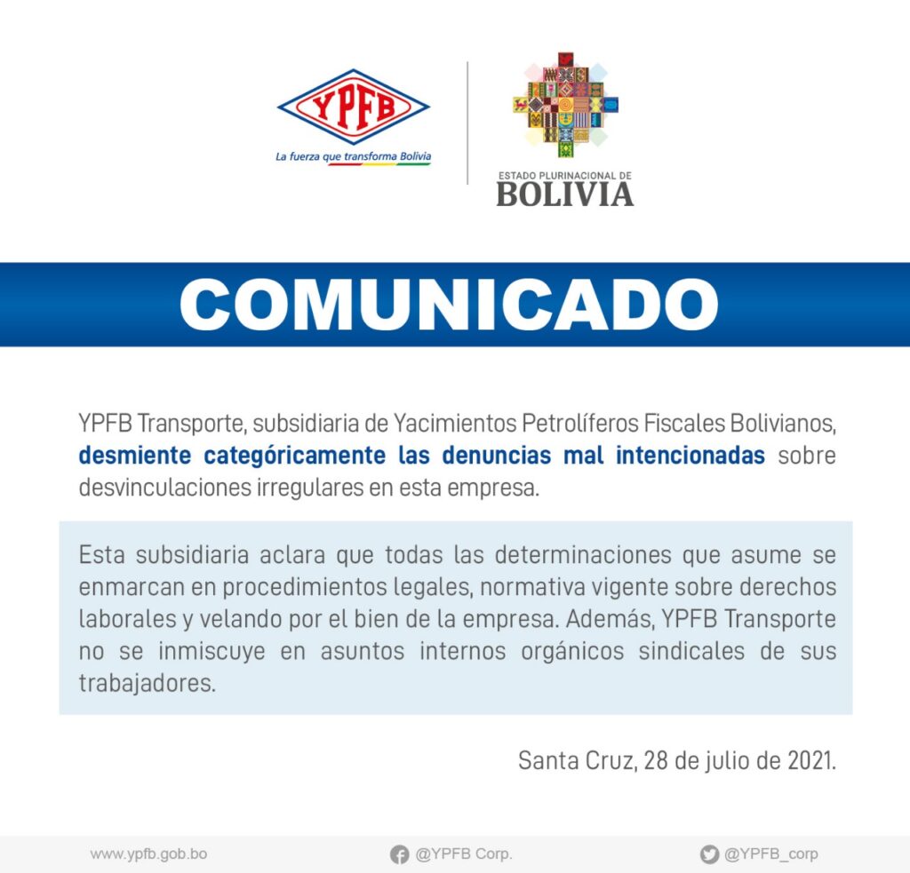 YPFB Transporte, subsidiaria de Yacimientos Petrolíferos Fiscales Bolivianos, desmiente categóricamente las denuncias mal intencionadas sobre desvinculaciones irregulares en esta empresa. Esta subsidiaria aclara que todas las determinaciones que asume se enmarcan en procedimientos legales, normativa vigente sobre derechos laborales y velando por el bien de la empresa. Además, YPFB Transporte no se inmiscuye en asuntos […]