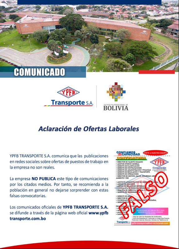 YPFB TRANSPORTE S.A. comunica que las publicaciones en redes sociales sobre ofertas de puestos de trabajo en la empresa no son reales. La empresa NO PUBLICA este tipo de comunicaciones por los citados medios. Por tanto, se recomienda a la población en general no dejarse sorprender con estas falsas convocatorias. Los comunicados oficiales de YPFB […]