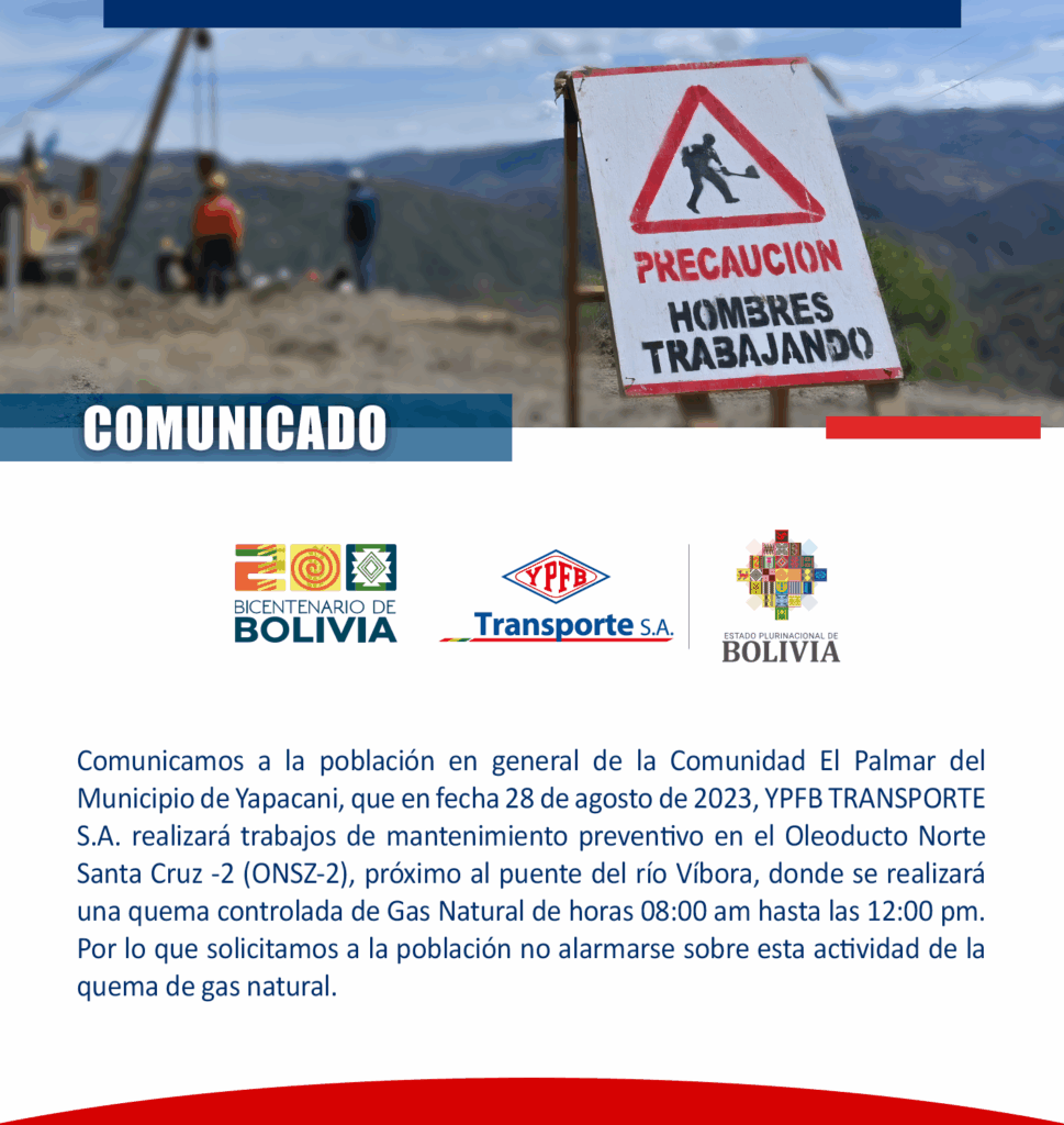 Comunicamos a la población en general de la Comunidad El Palmar del Municipio de Yapacaní, que en fecha 28 de agosto de 2023, YPFB TRANSPORTE S.A. realizará trabajos de mantenimiento preventivo en el Oleoducto Norte Santa Cruz – 2 (ONSZ-2), próximo al puente del río Víbora, donde se realizará una quema controlada de Gas Natural […]
