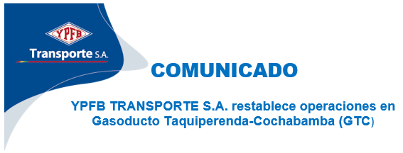 Comunicamos a la población de los departamentos de Chuquisaca y Potosí que, a Hrs. 03:40 de la mañana del día domingo 02 de enero de 2022, se restablecieron las operaciones de transporte del Gasoducto Taquiperenda-Cochabamba (GTC). Al momento, el suministro de gas natural a las ciudades de Sucre y Potosí es absolutamente normal, así como […]