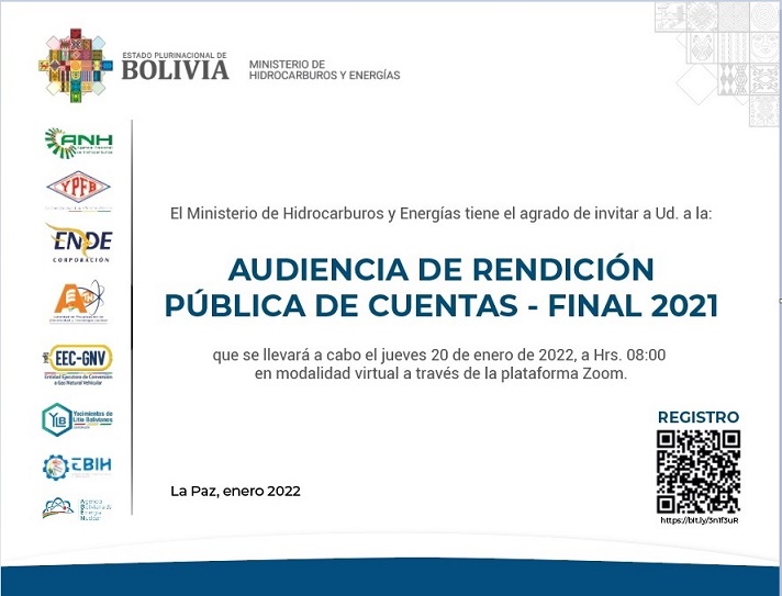El Ministerio de Hidrocarburos y Energías tiene el agrado de invitar a Ud. a la: AUDIENCIA DE RENDICIÓN PUBLICA DE CUENTAS – FINAL 2021 que se llevará a cabo el jueves 20 de enero de 2022, a Hrs. 08:00 en modalidad virtual a través de la plataforma Zoom